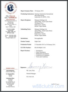 W88 đã đạt được 6 chứng nhận GLI ở 6 sản phẩm: Night club, Baseball, Roman Empire, Bikini beach, Mafia và The Monkey King.